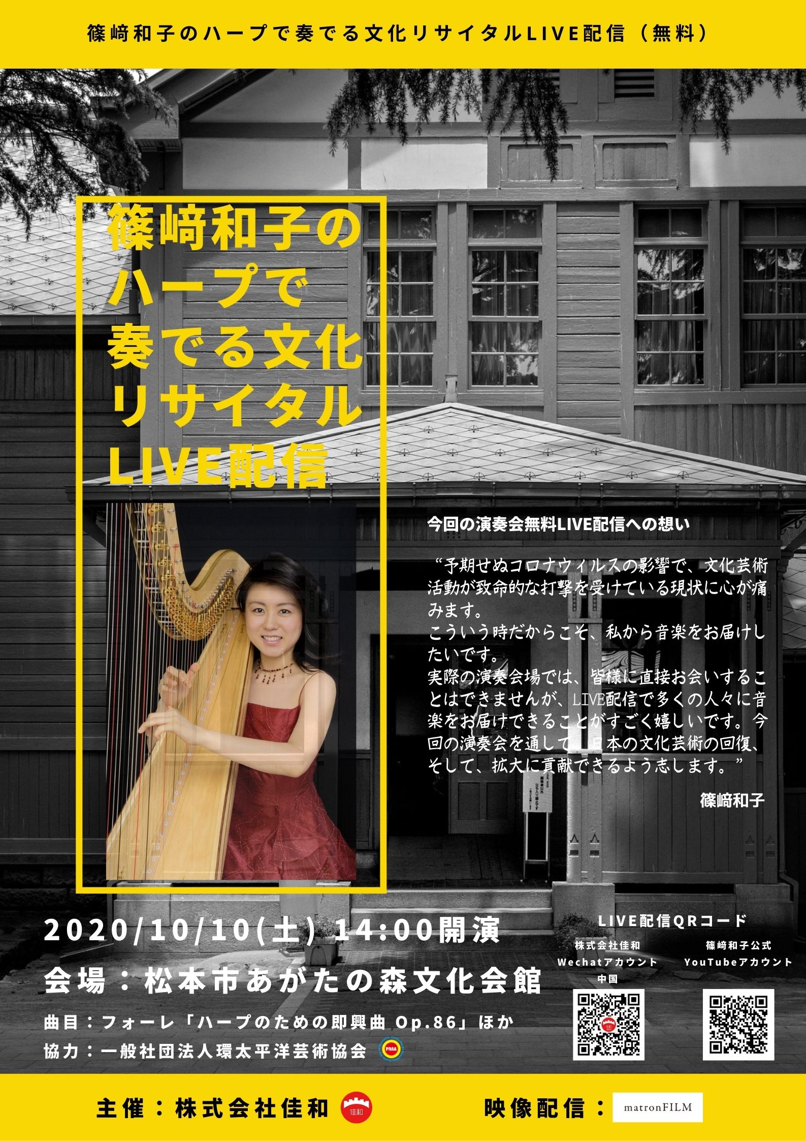 新型コロナウィルスの影響で、文化芸術活動が致命的な打撃を受けると同時に、社会全体の姿について、再考する必要に迫られています。この度、約100年前、大正時代のスペイン風邪流行収束後に生まれた、築100年近くある歴史的建造物「あがたの森文化会館」を舞台に、無観客LIVE配信を実行します。この演奏会(無料LIVE配信)を通して、日本の文化芸術の回復、そして、拡大に貢献できるよう志します。