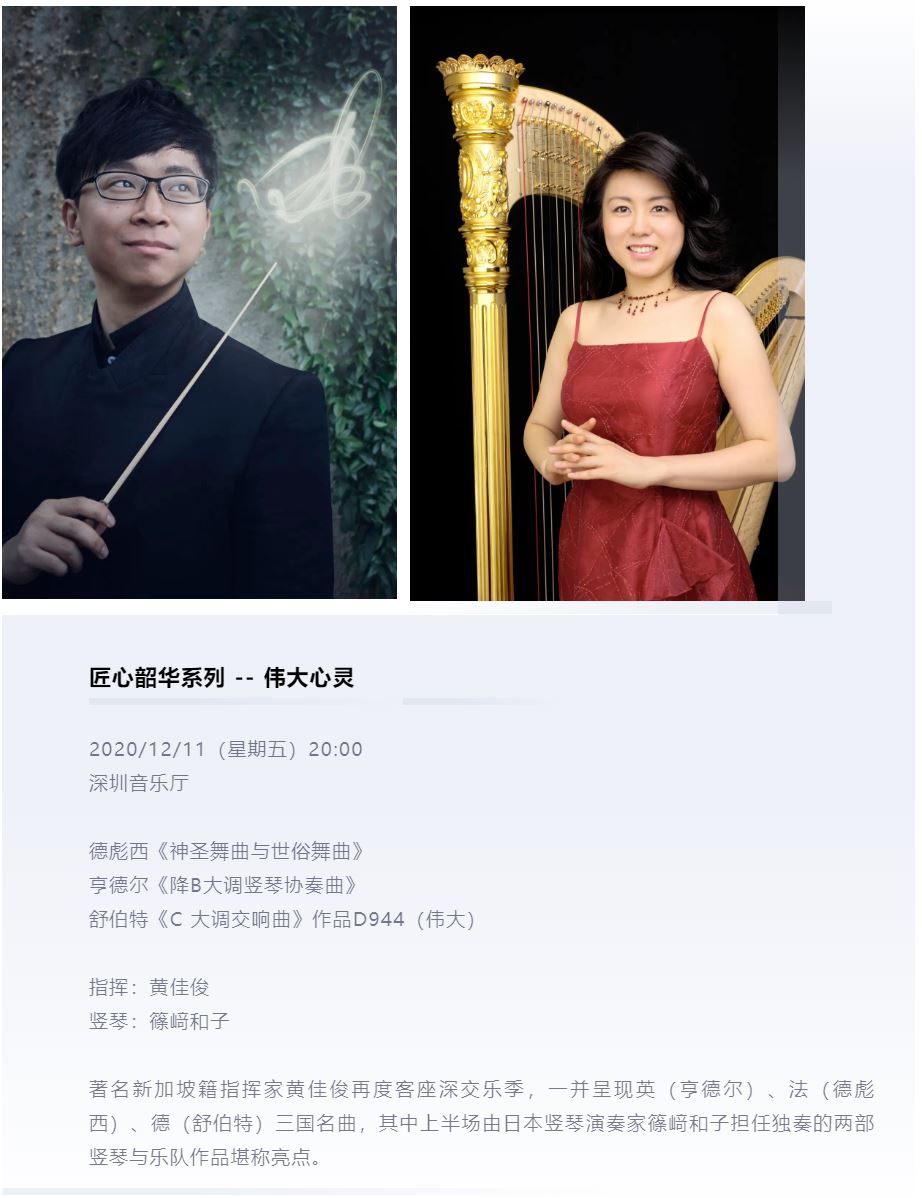 著名新加坡籍指挥家黄佳俊再度客座深交乐季,一并呈现英(亨德尔)、法(德彪西)、德(舒伯特)三国名曲,其中上半场由日本竖琴演奏家篠﨑和子担任独奏的两部竖琴与乐队作品堪称亮点。